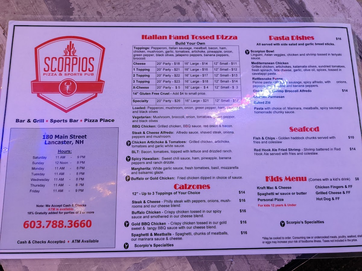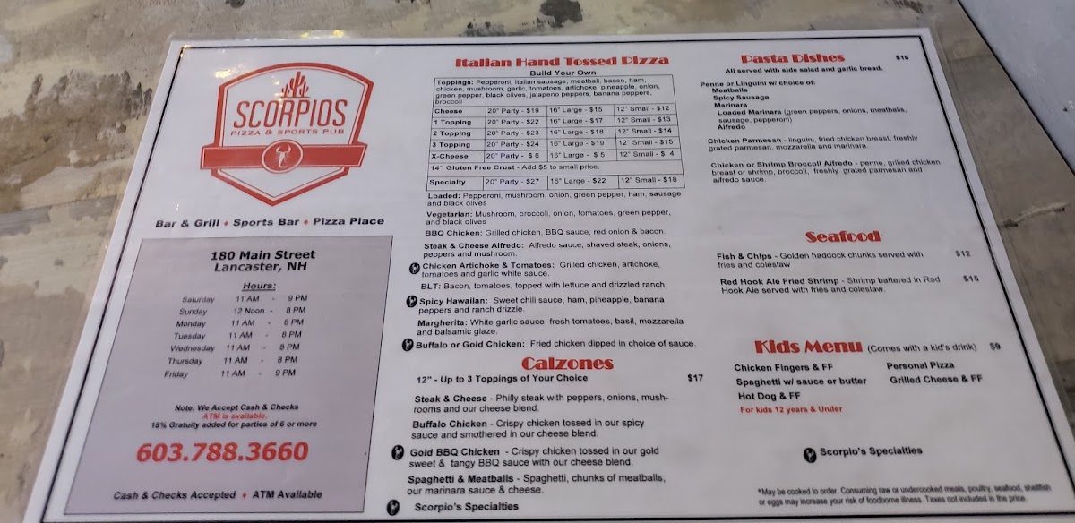 Welcome to Scorpio's Pizzaria & Sports Pub, a culinary gem nestled in the heart of Lancaster, NH. This inviting establishment offers a diverse menu that caters to all cravings. Whether you’re in the mood for a mouthwatering pizza, a crisp salad, or hearty calzones, there’s something here for everyone.